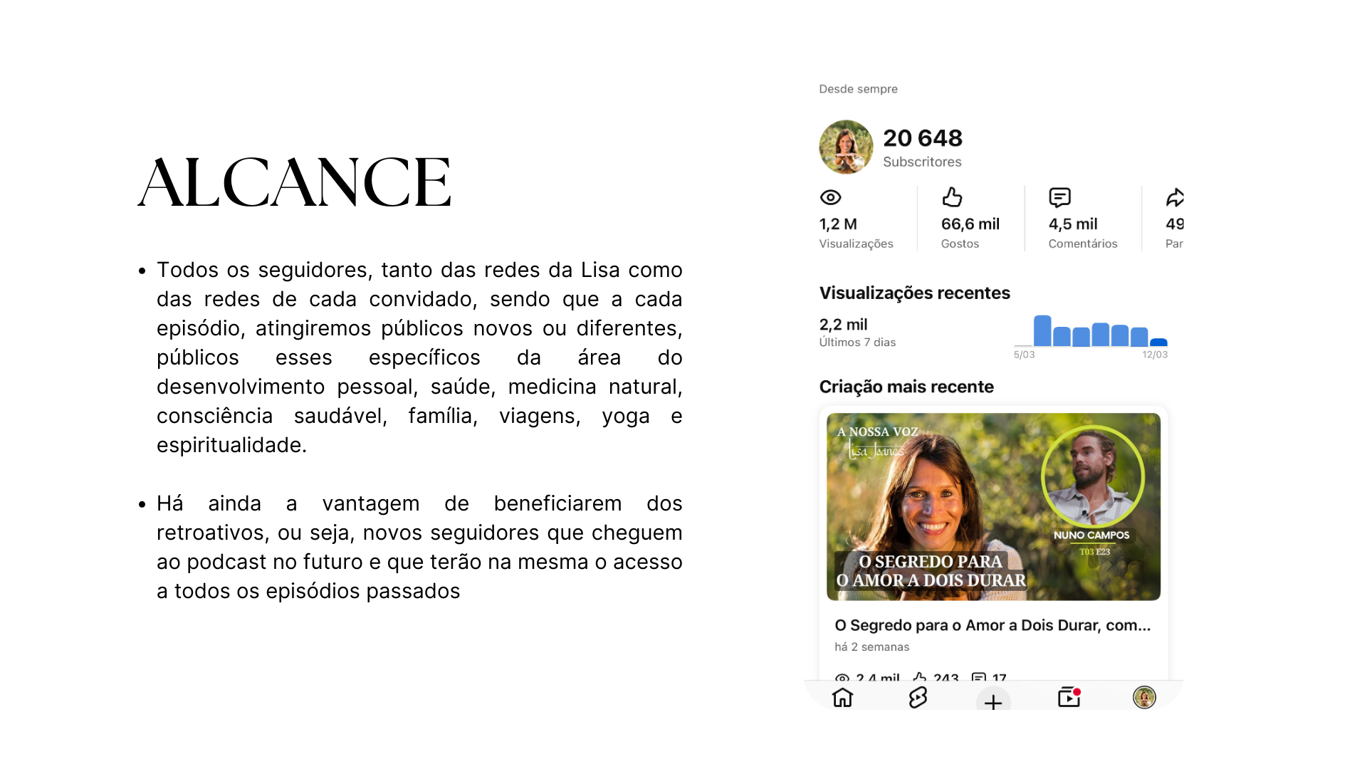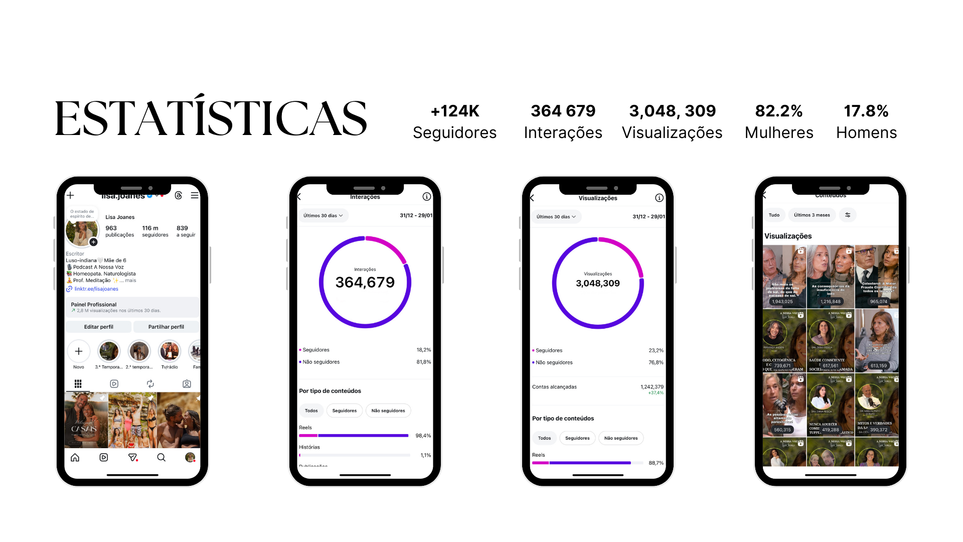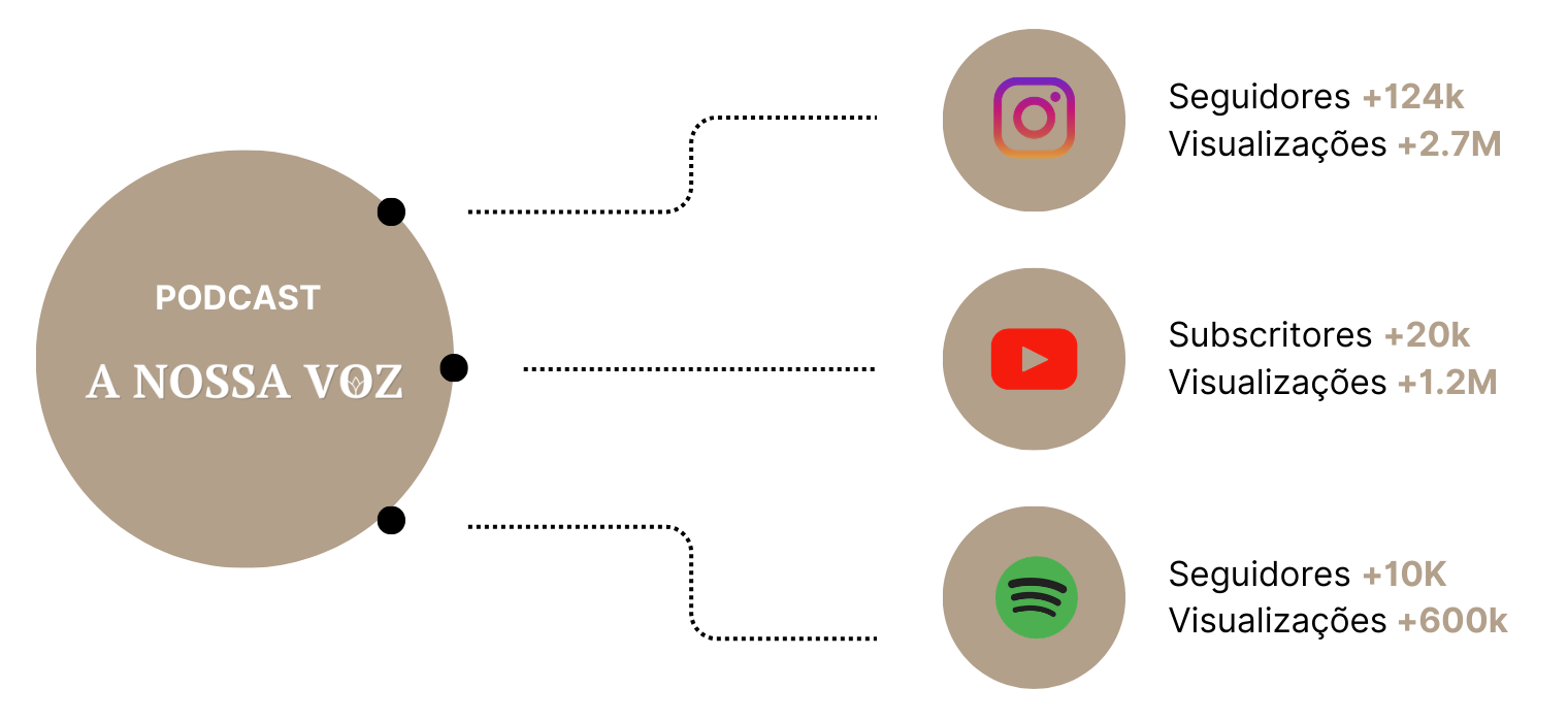 A Nossa Voz alcança milhões de visualizações e tem uma linda comunidade associada, profundamente alinhada com todos estes conteúdos. Também a minha página de instagram tem mais de 120k seguidores e um forte engagement, com reels a chegar a centenas de milhares de visualizações e milhares de comentários.